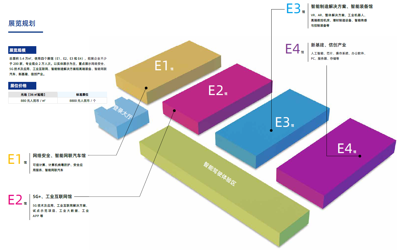 規(guī)模:總面積5.4萬㎡,計劃使用四個展館(E1、E2、E3和E4),計劃招展企業(yè)不少于200家,專業(yè)觀眾2萬人次。以實體展示為主,重點展示網(wǎng)絡(luò)安全、5G技術(shù)及應(yīng)用、智能裝備、智能網(wǎng)聯(lián)汽車、智能終端及芯片。